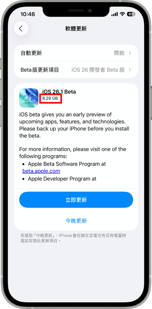 點選「Beta 版更新項目」後選擇「iOS 26 開發者 Beta 版」,接下來返回上一頁,等待系統資料讀取完畢後,就會看到 iOS 26.1 Beta 版本的更新資訊,使用者可以自己選擇是否立即更新,而使用者在更新之前也要確定一下自己的手機空間容量是否足夠下載、安裝 iOS 26.1 開發者版本。