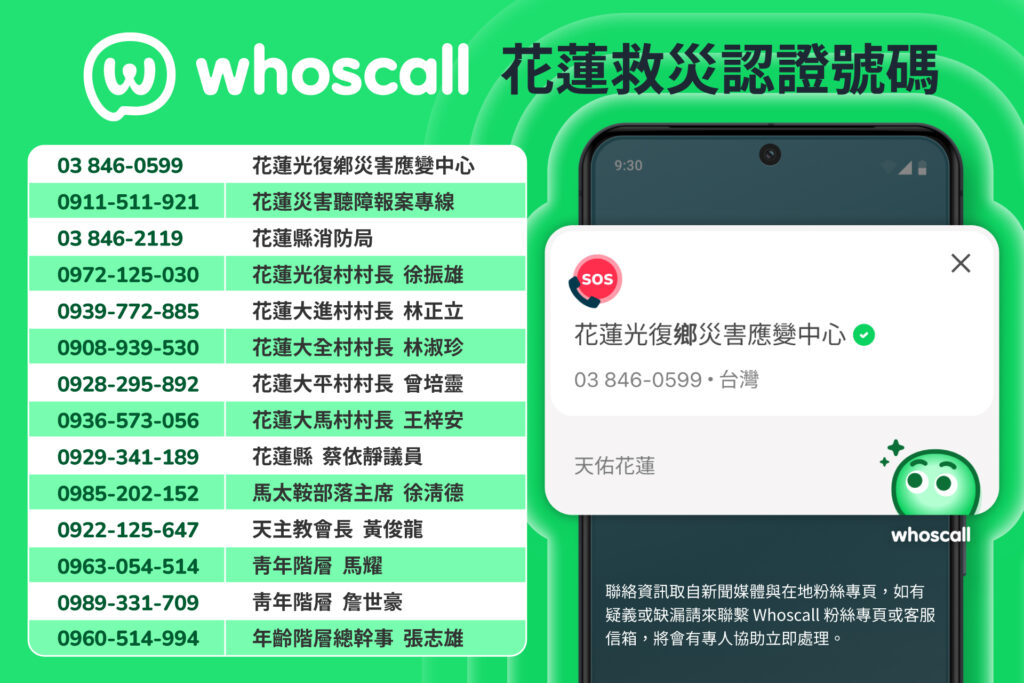 註:本次已暫時性納入 Whoscall《認證號碼》服務的電話號碼清單,主要取自數間新聞媒體與花蓮在地粉絲專頁,經多方比較查證。然因事態緊急無法且為不影響救災作業,尚未取得每位當事人與機構之同意,如有疑義或缺漏請聯繫官方粉絲專頁或來信 [email protected],將會有專人協助立即處理。造成不便,敬請見諒!