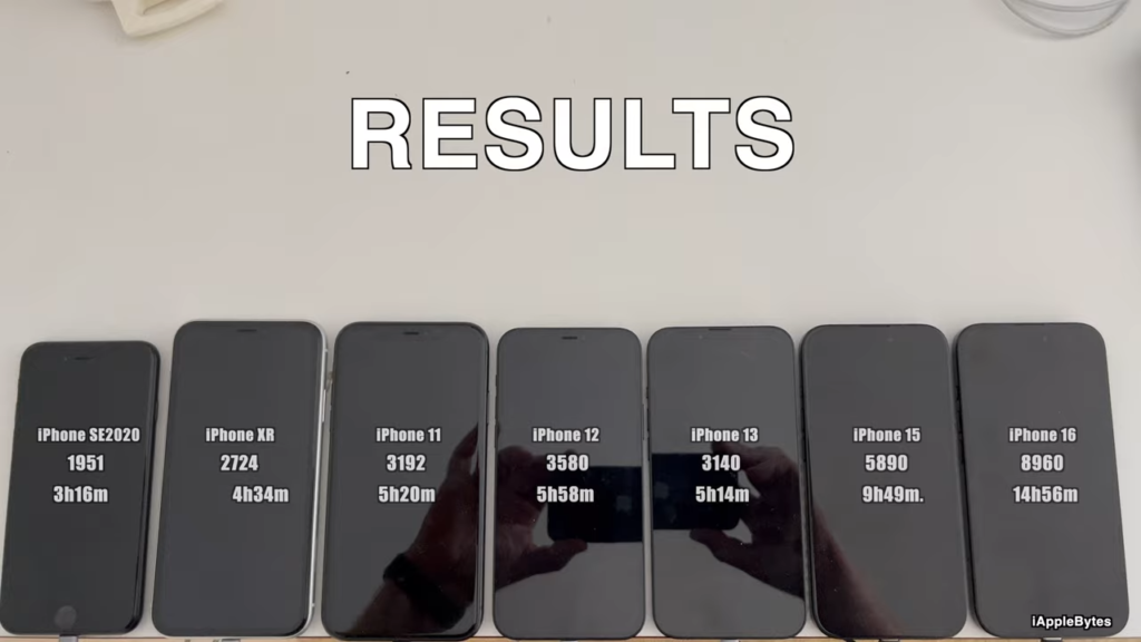 依據實測結果顯示, 6 款 iPhone 更新至 iOS 26.0.1 後持續運行至沒電,所花費時間分別為下: