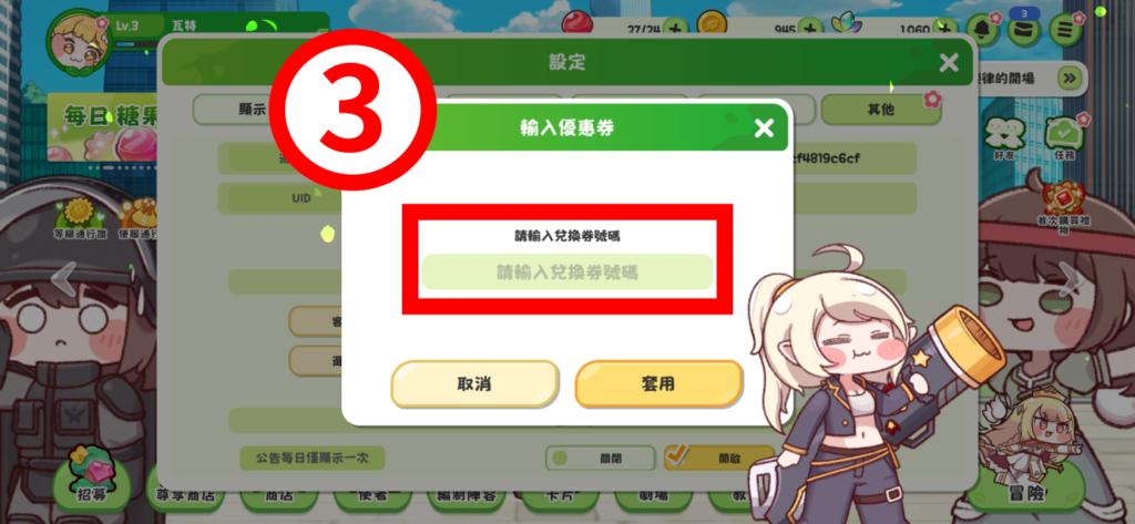 - 步驟(3)、輸入「兌換券號碼」,兌換成功後獎勵可於信箱中領取。