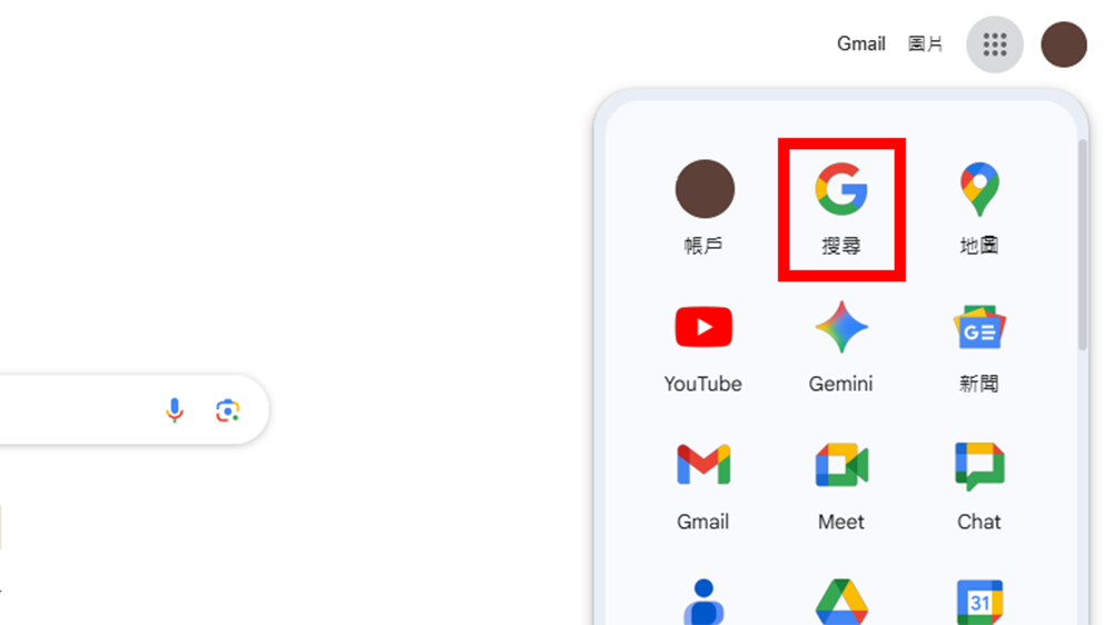 - 步驟(一)、進入首頁後,點開右上角的應用程式選單,選擇「Google 搜尋」