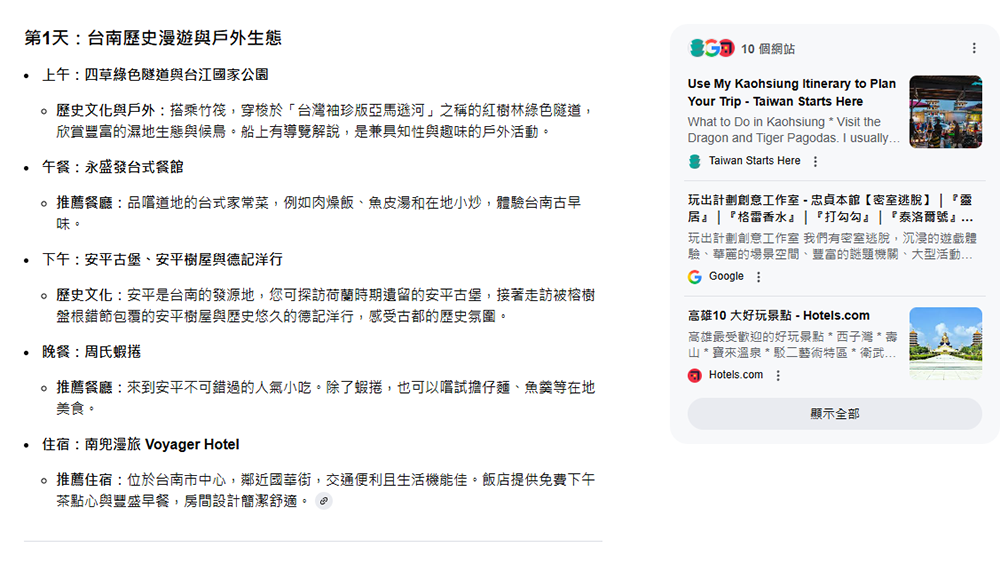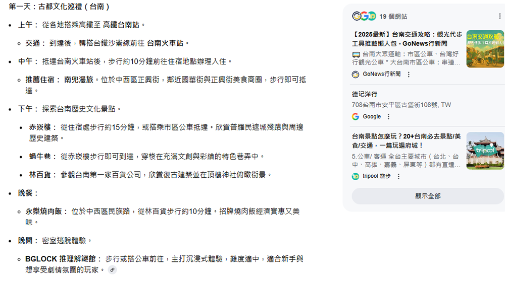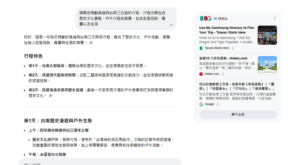 - 問題內容:請幫我規劃高雄與台南三日遊的行程,行程內需包含歷史文化景點、戶外行程或展覽,包含密室逃脫、餐廳以及住宿。