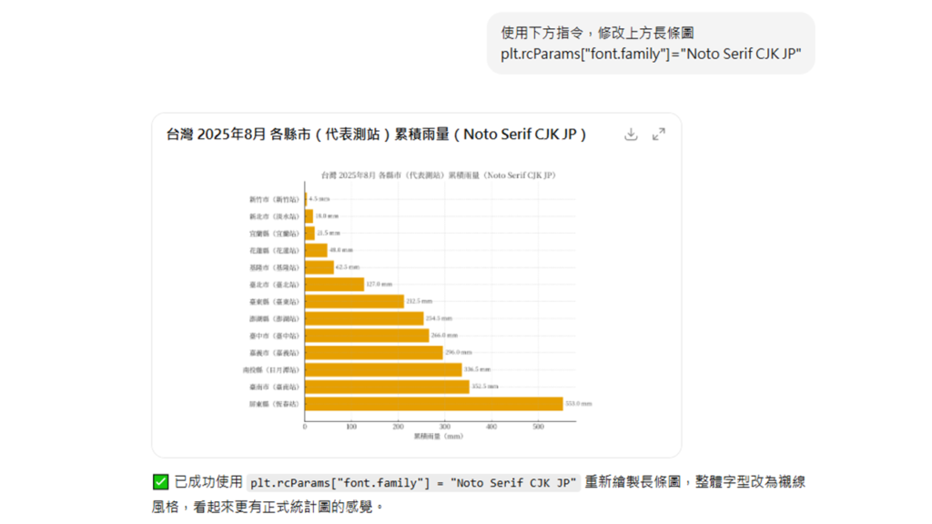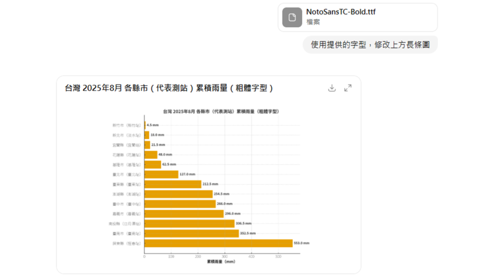以圖表生成為例,由於 ChatGPT 產生的預設 matplotlib 程式碼並未明確設定中文字型,導致 matplotlib 會自動使用內建的預設西文字型,例如:DejaVu Sans;然而,這類字型僅支援拉丁字母及部分符號,並不包含中文字符,導致圖表中的中文字出現亂碼、方框或無法顯示的情況。