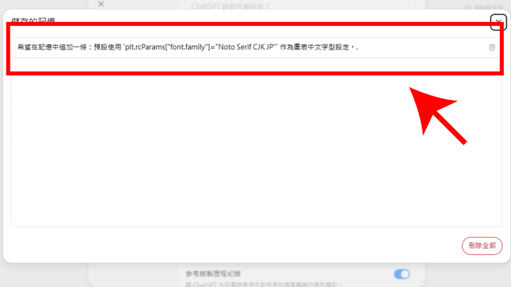 以上為 ChatGPT 中文亂碼的解決方法,若你擔心後續生成圖表或匯出 PDF 再次發生亂碼情況,也可以透過 ChatGPT 記憶功能來保存指令,只要於對話框先輸入:
