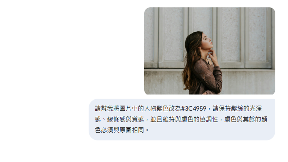 - 髮色修改完整指令:請幫我將圖片中的人物髮色改為#3C4959,請保持髮絲的光澤感、線條感與質感,並且維持與膚色的協調性,膚色與其餘的顏色必須與原圖相同。