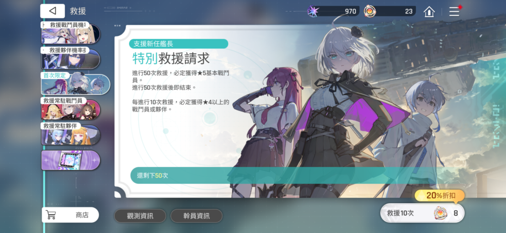 《卡厄斯夢境》的抽卡分為「戰鬥員」與「夥伴」兩種,首抽建議以「戰鬥員」為優先,卡池建議可先抽 80% 折扣的 50 抽保底「特別救援請求」(俗稱:新手卡池)。