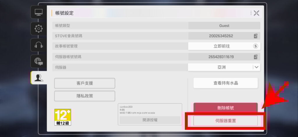 ▼ 右上角選單 → 設定 → 帳號 → 伺服器重置