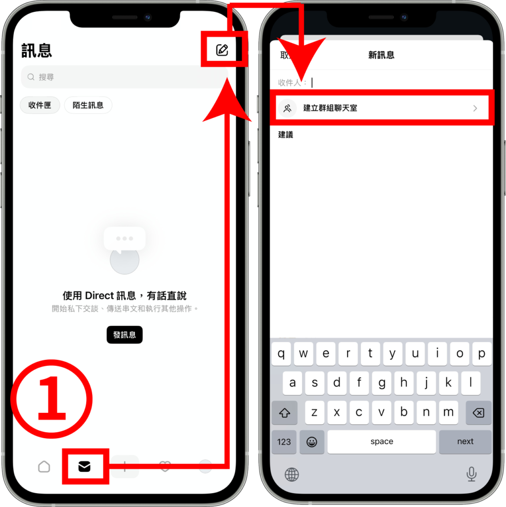 打開 Threads 選擇下排「訊息」(郵件圖示),打開右上角功能(鉛筆圖示),便可找到「建立群組聊天室」。