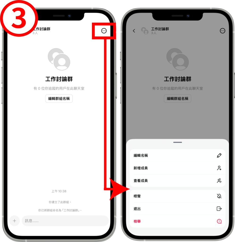 如何用戶在上步驟中忘記設定群組名稱,也可再次於「編輯群組名稱」中設定聊天室名稱,後續若要「新增成員」、「退出」,也可開啟右上角「…」進行。