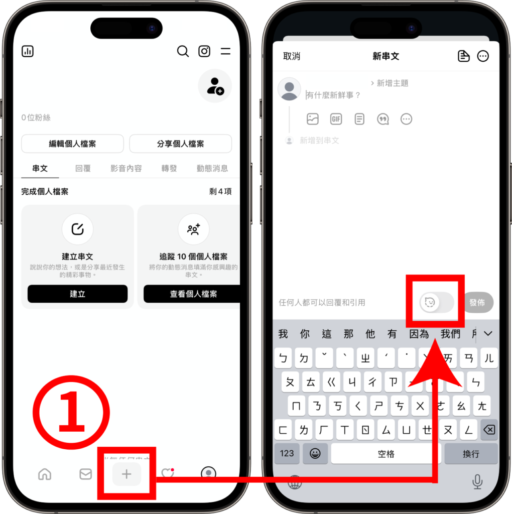 開啟 Threads App,點選下方「+」(或動態牆上的「對話框」)進入貼文發布模式,再點選下方的「幽靈按鍵」。