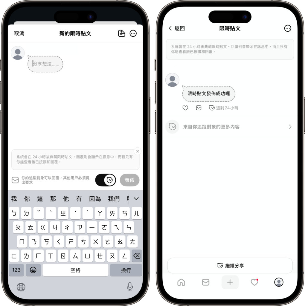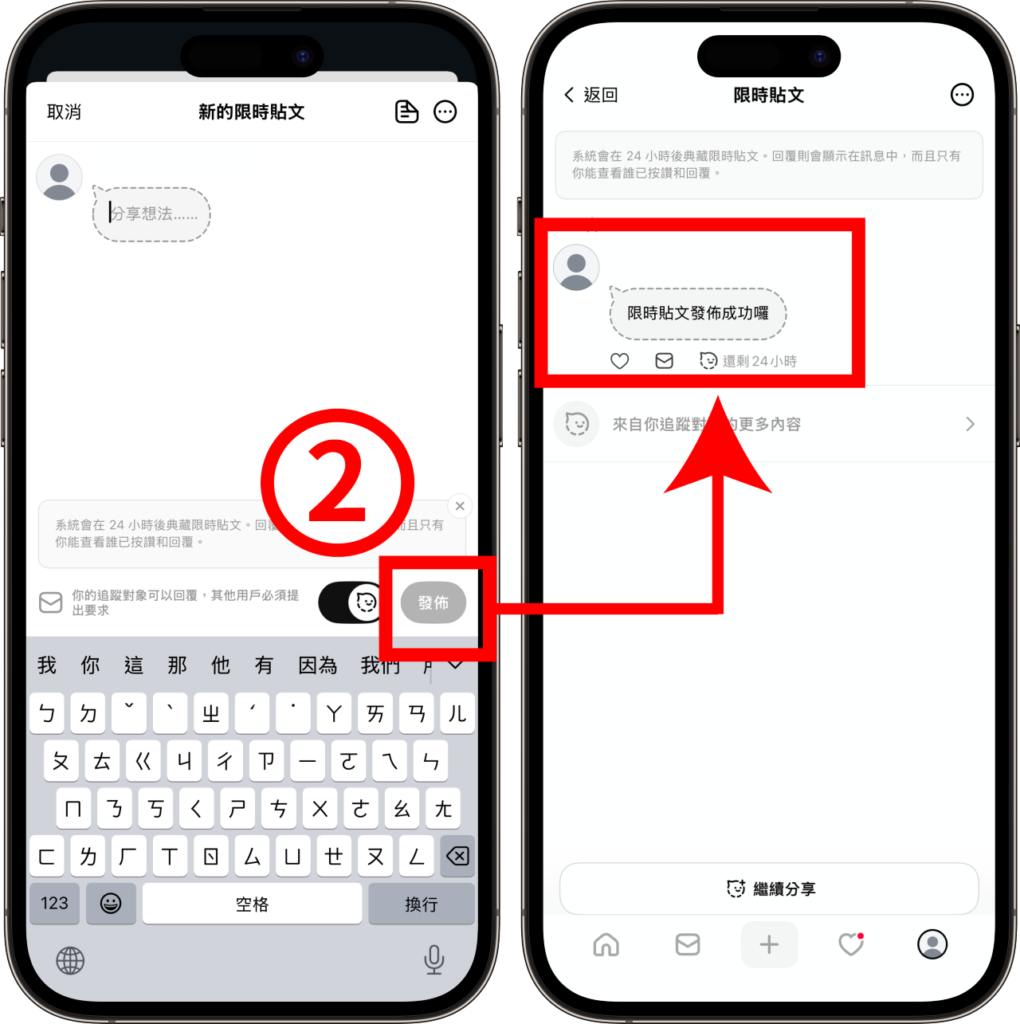 撰寫想要分享的文字、圖片等內容,輸入完成後點選「發佈」,即可傳送限時 24 小時的限時貼文。