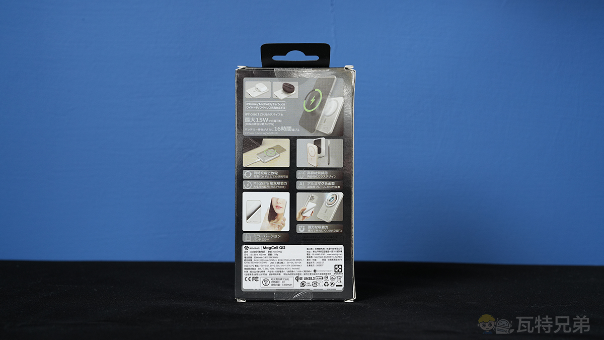 先聊聊包裝的部分,基本上「救世 Qi2 行動電源」這方面表現中規中矩,採用常見的紙盒 + 透明塑膠設計,可直觀從外部觀測內部行動電源,有助於消費者購買前更進一步評估;至於外包裝的規格說明,可能會有消費者擔心都是日文看不懂,但其實廠商有額外貼一張繁體中文的說明貼紙,相關規格可從中了解。