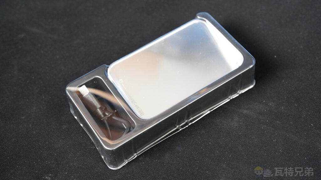 打開包裝後,可發現「救世 Qi2 行動電源」與「附贈的充電線」皆以塑膠蓋、塑膠盒上下固定,即使受到外力搖晃,內部的行動電源也不太會位移,也不太會發出碰撞聲響,具有一定的防撞效果,也可降低產品因撞擊磨損可能性。