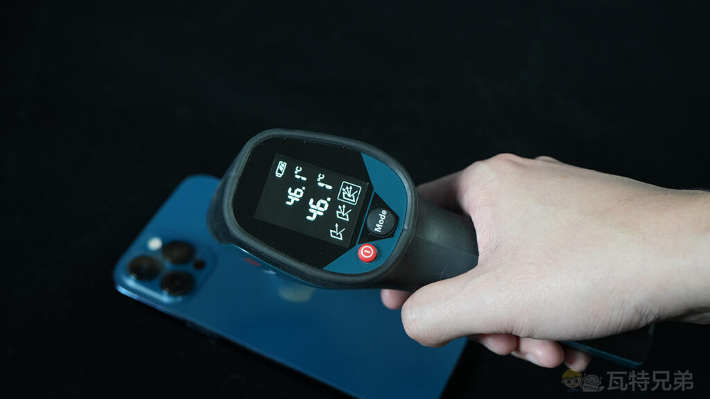 以下測試中,瓦特將會以「救世 Qi2 行動電源」為 iPhone 12 Pro Max 充電,該手機的電池健康度為 94%,電量介於 20%~30% ,進行約 30 分鐘的無線充電,後續則分別測量「救世 Qi2 行動電源」與「 iPhone 12 Pro Max」溫度。