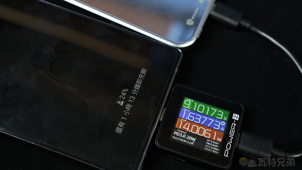 在以下實測中,瓦特會以電量介於 20%~30%(避免涓流充電)的 Galaxy Note 20 進行有線充電,測得功率為 9.1V/ 1.6A(14W),左下角也顯示出正以 PD3.0 20W 協議進行充電。