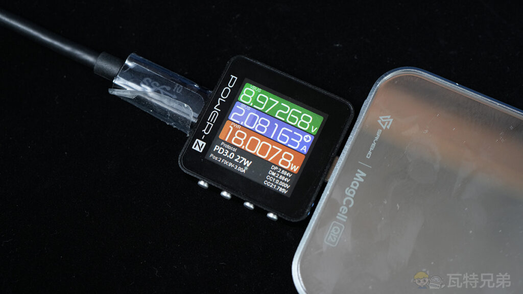 在無線充電未使用的情況下,依據規格顯示可能會有 5V/3A(15W)或 9V/2A(18W)兩種輸出功率,最大可用 18W 進行充電;經瓦特實測後,可看到其輸入功率為 8.9V/2A(18W),輸出功率可達最大的 18W,符合官方規格描述。