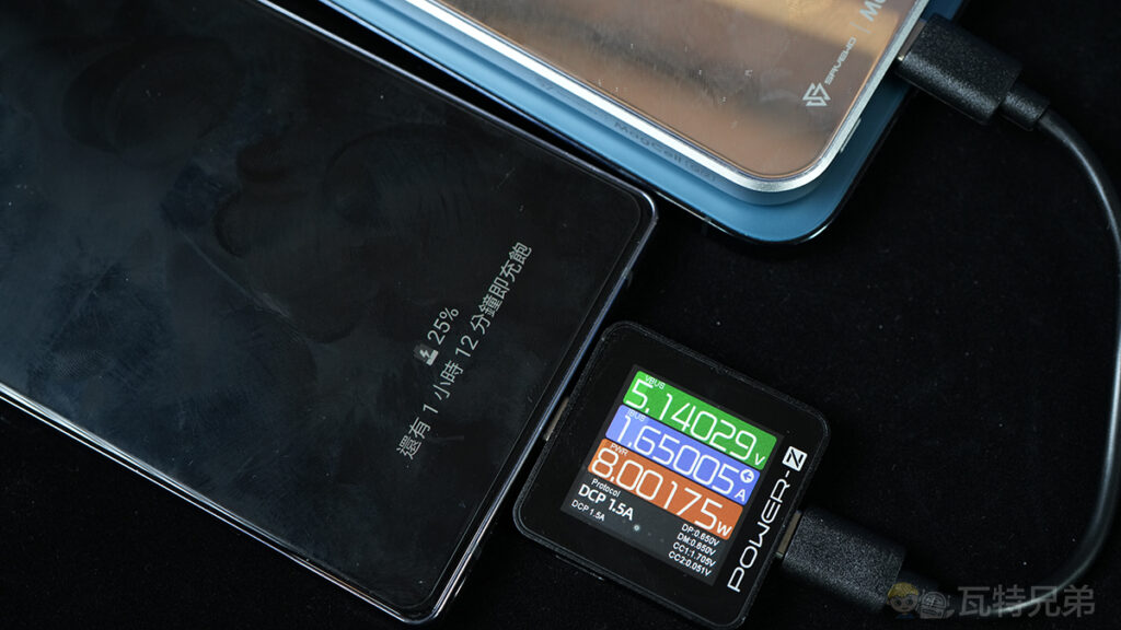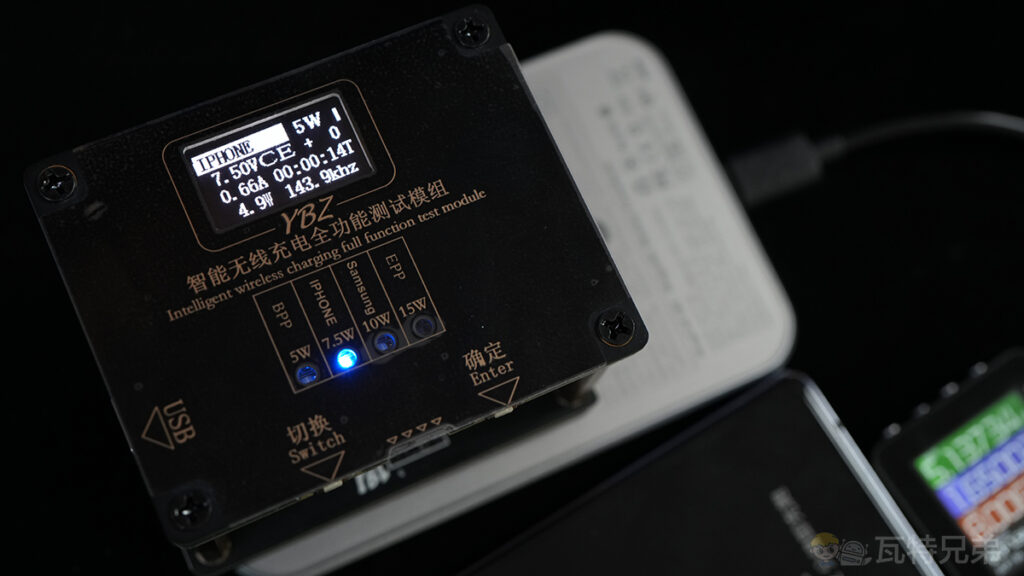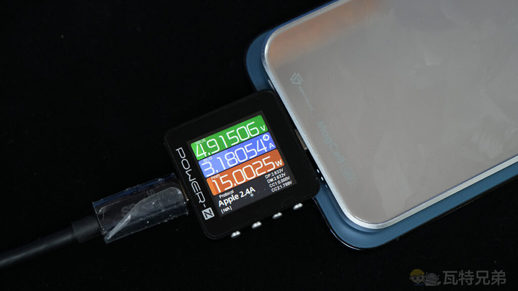首先是「無線充電」實測,這部分瓦特會以專業工具進行檢查,確認最大無線充電功率能否相容 iPhone 的 MPP 協議,支援最高 15W 的 iPhone 無線充電。