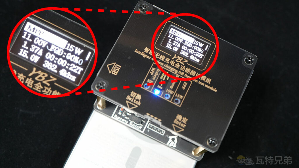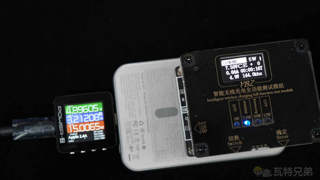 首先是「無線測試」,瓦特會以專業的測試工具進行檢測,確認是否支援 iPhone 15W 充電,藉此檢視官方所標示的無線充電速度,是否符合最大的 15W。