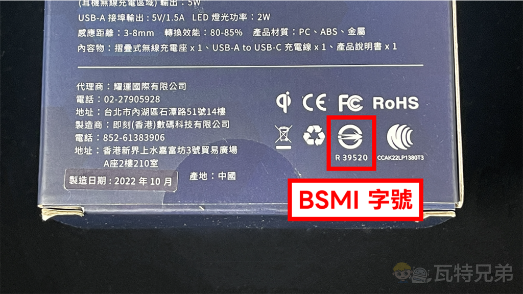 首先我們可以在商品外包裝的背面說明欄位找到 BSMI 字號圖示,BSMI 字號的圖形很好認,只要看到一個圓形中間帶有一個向右的箭頭那就是 BSMI,在這個圖形的下方有一串 6 個字元的認證碼,這串驗證碼就是表示這件產品的 BSMI 認證碼,如果不確定的話,也可以透過網路搜尋找到該產品的 BSMI 認證碼。