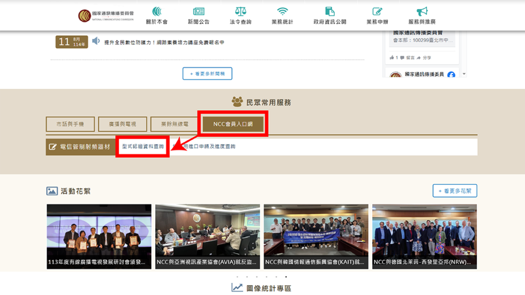 確認好 NCC 字號後,大家可以點選下方的連結直接進入到 NCC 型式認證資料查詢頁面,或是進入到 NCC 官網當中,將頁面下滑到「民眾常用服務」當中,並選擇「NCC 會員入口網」,點選「型式認證資料查詢」,就可以進入到查詢頁面當中了!