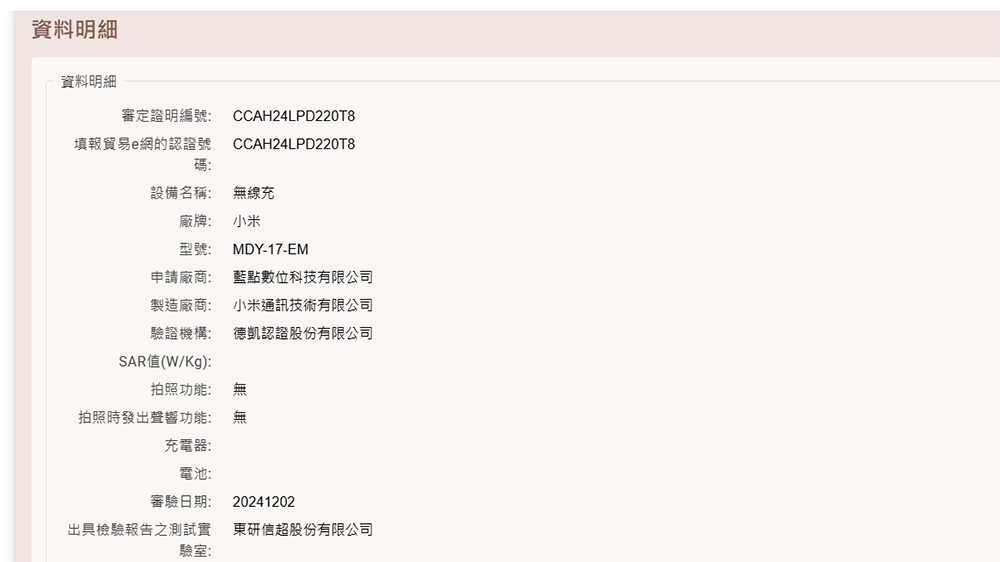 同樣以小米無線充電器為例,將查詢到的 NCC 字號輸入到「型式認證號碼」的輸入框當中,其餘的內容可填可不填,記得在進行查詢之前要輸入驗證碼,再按下「查詢」,才能夠順利查找資料喔!