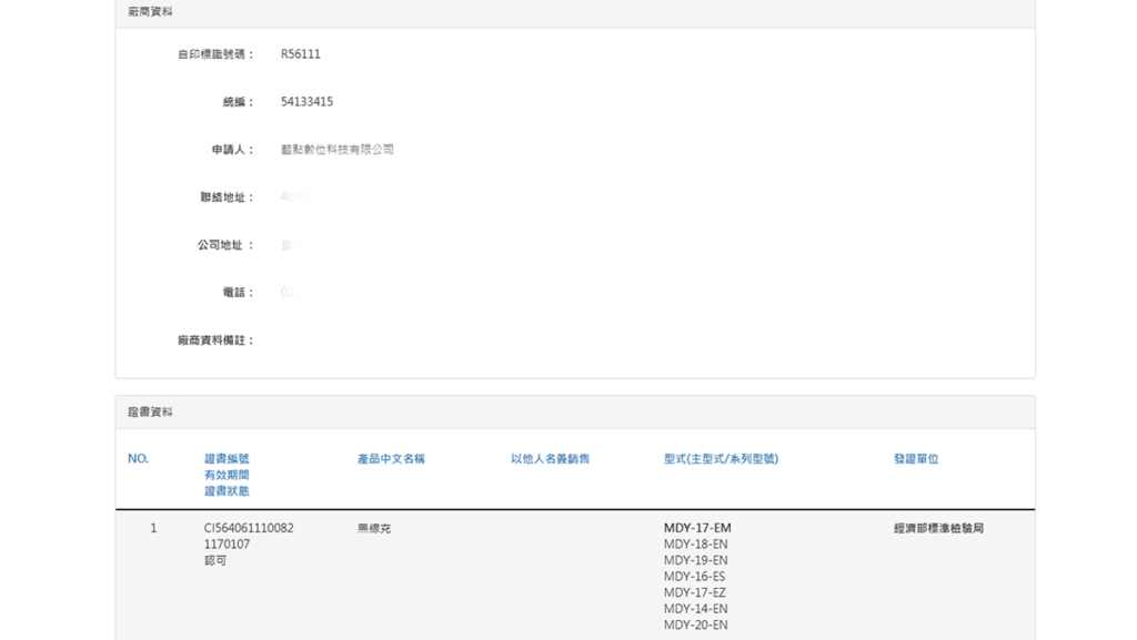 填完 BSMI 驗證碼後會出現型號的輸入區域,這邊可以填寫型號讓系統更準確的抓出資料,如果不知道型號或是不想填也沒關係,同樣也可以查得到相關資料,只是有的時候同一個 BSMI 認證字號向下會有多個產品,就會需要大家花點時間來對照產品的型號。