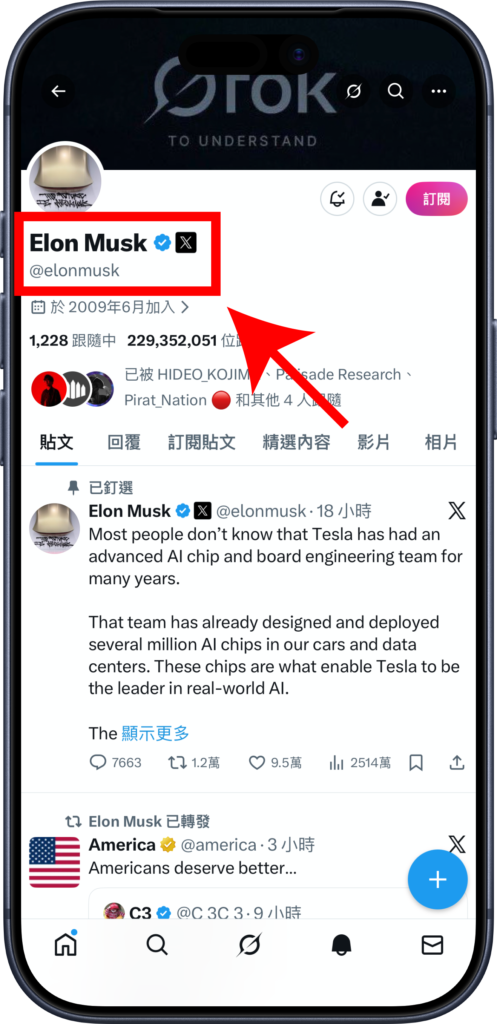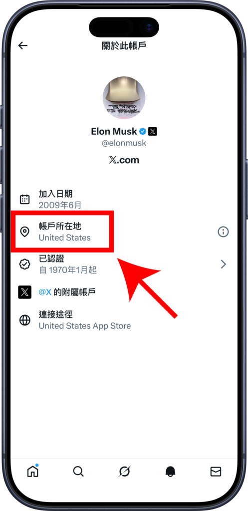 - 步驟(1)、進入想要查詢的 X 帳號「個人主頁」,與網頁版不同的是,App 版並未顯示「關於此帳號」,需要改成點選左上角的「帳戶名稱」。