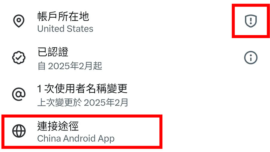 - 另外,若帳號所在地旁顯示出「護盾框的驚嘆號」,這代表「國家或地區可能不準確」,該用戶很有可能使用 VPN。