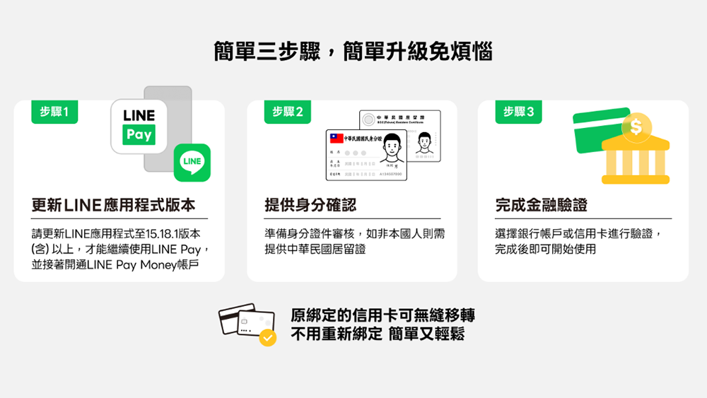 身分審核通過後,後續則要選擇銀行帳戶或信用卡進行金融驗證,完成後即可開始使用儲值、好友轉帳、生活繳費等金融功能。