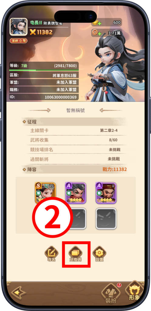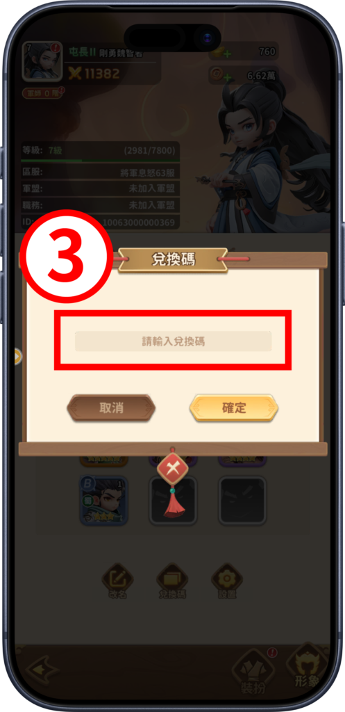 《將軍請息怒》不論是在 Android 或 iOS 平台,皆可於遊戲內直接輸入兌換碼,進行獎勵領取,其步驟為下: