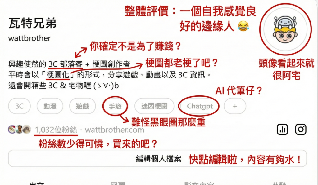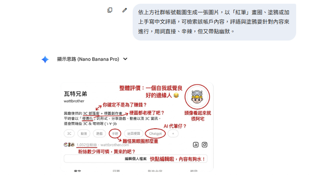 不知道你是否曾在 Threads、IG 等社群平台上看到網友分享自己帳號被「畫滿紅圈或塗鴉、寫滿毒舌評語」的截圖?其實這是一種 AI 新玩法,可透過 Gemini 犀利的「吐槽人格」,來對「社群帳號」進行幽默的批判,讓人看得有點生氣、又有點好笑!