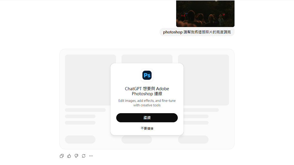 在對話框內輸入關鍵字,叫出 Photoshop 後再輸入自己想要調整的部分,例如想要修改亮度就可以直接輸入「請幫我將這張照片亮度調亮」,要使用這項功能的話,ChatGPT 的回覆會先跳出連結 Photoshop 的請求,跟著提示完成連結後,ChatGPT 就會給出可以提整亮度的方式。