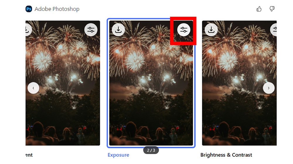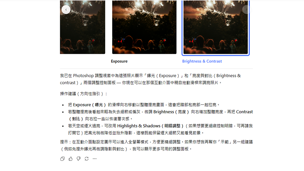 以調整照片亮度為例,ChatGPT 給出了「調整曝光、亮部暗部」以及「調整亮度與對比」兩種方式,可以直接點選相對應模式右上角的拉桿圖示進入調整參數的頁面,使用者可以透過拉桿來調整照片所呈現的效果,如果是有修圖經驗的人也可以在此頁面連接到 Photoshop 網頁版進行修圖。