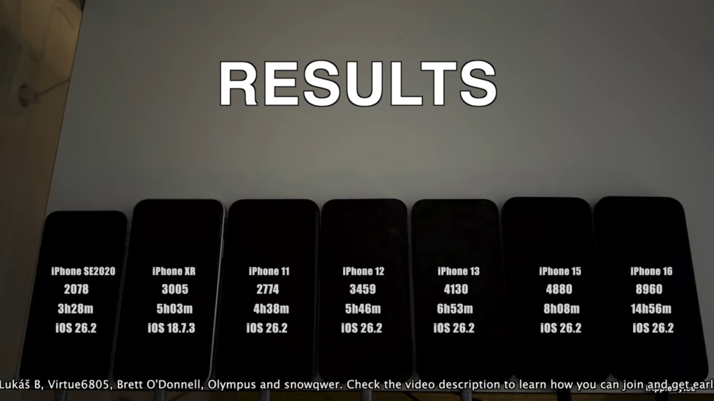 依據實測結果顯示, 6 款 iPhone 更新至 iOS 26.2 後持續運行至沒電,所花費時間分別為下: