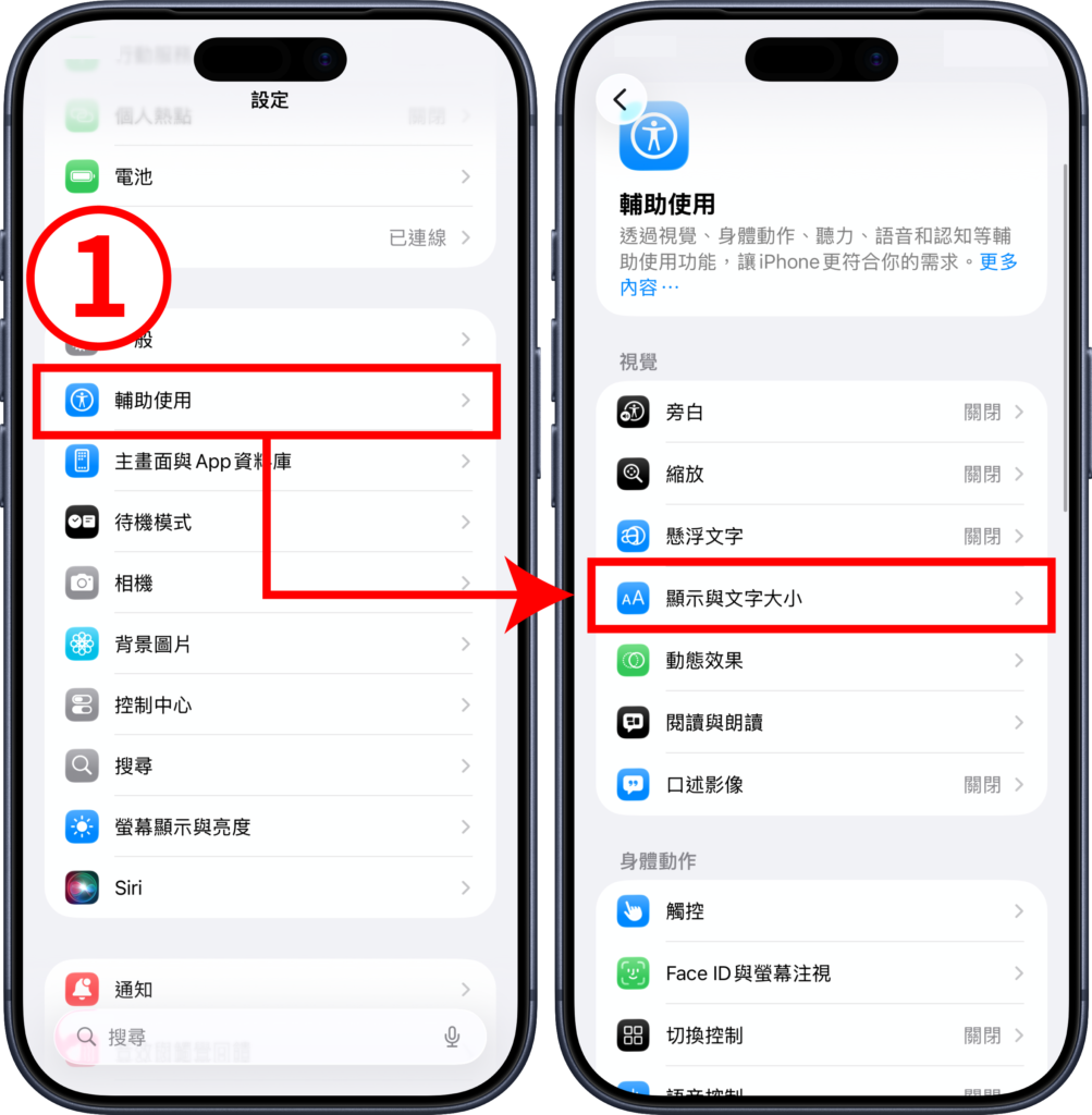 - 步驟(1)、開啟「設定」中的「輔助使用」,再點選「顯示與文字大小」。