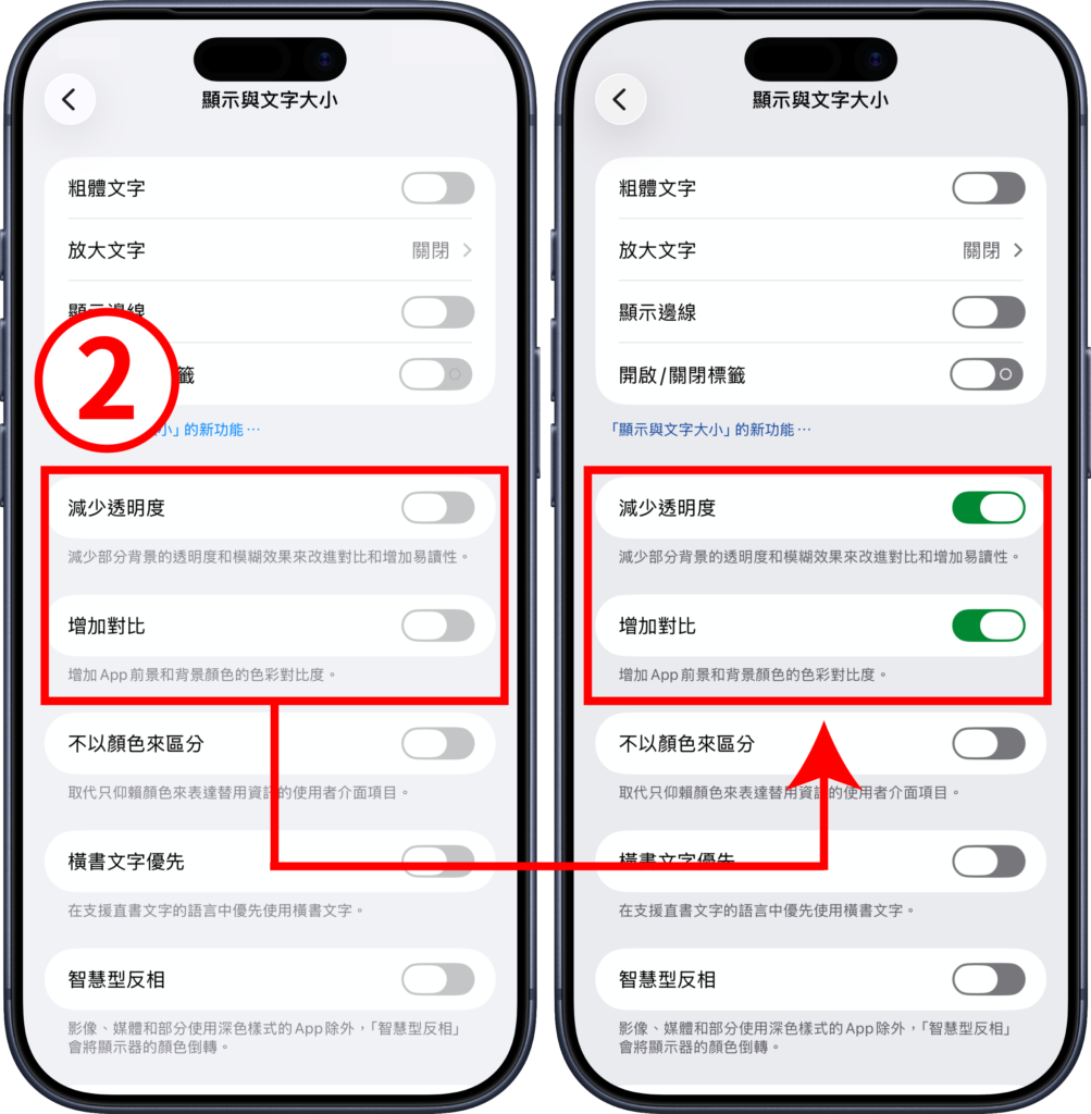 - 步驟(2)、可開啟「減少透明度」與「增加對比」,進行透明度調整。