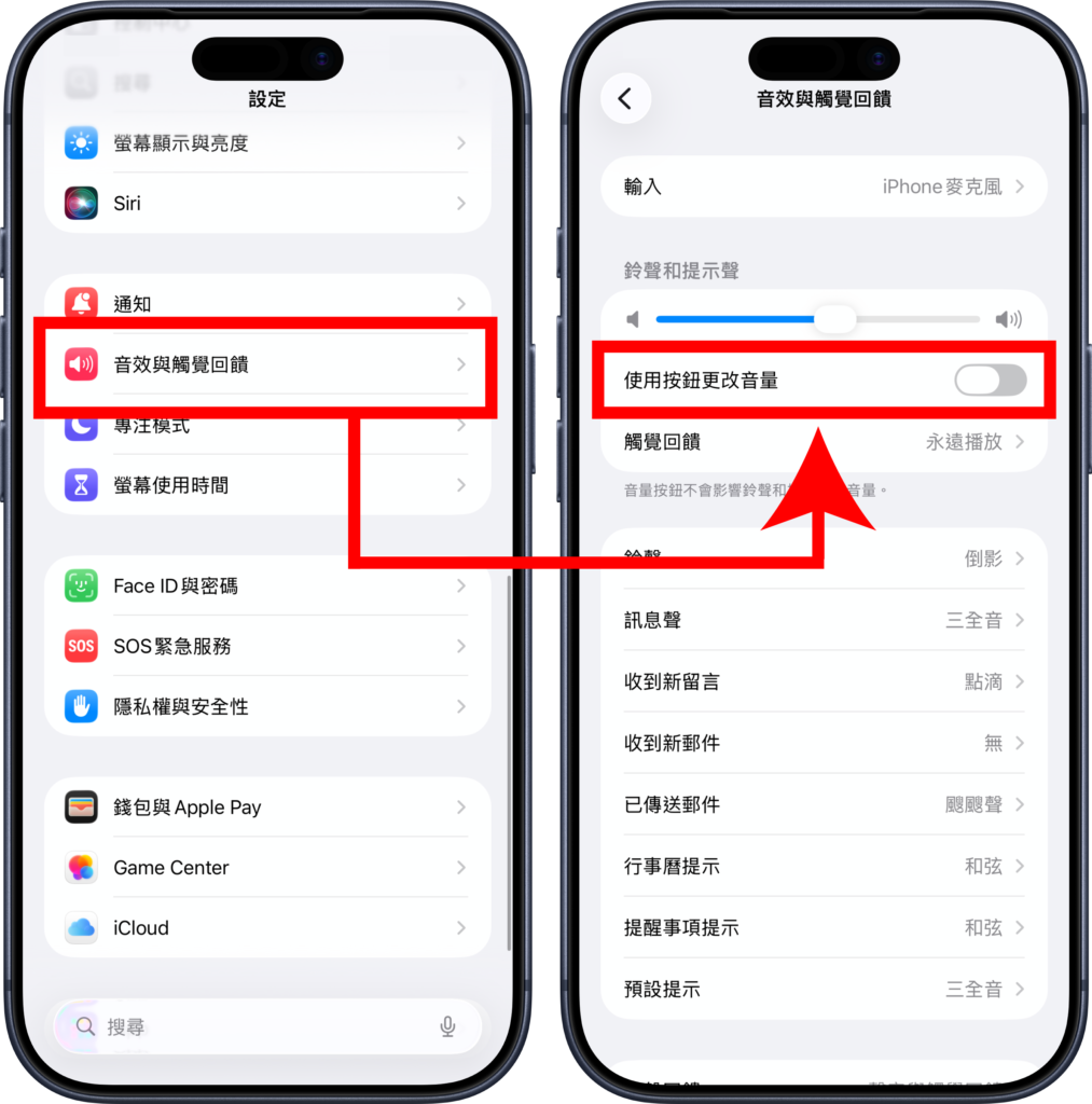 - 步驟(2)、先確認「鈴聲和提示聲」顯示的音量大小,並關閉下方的「使用按鈕更改音量」功能。