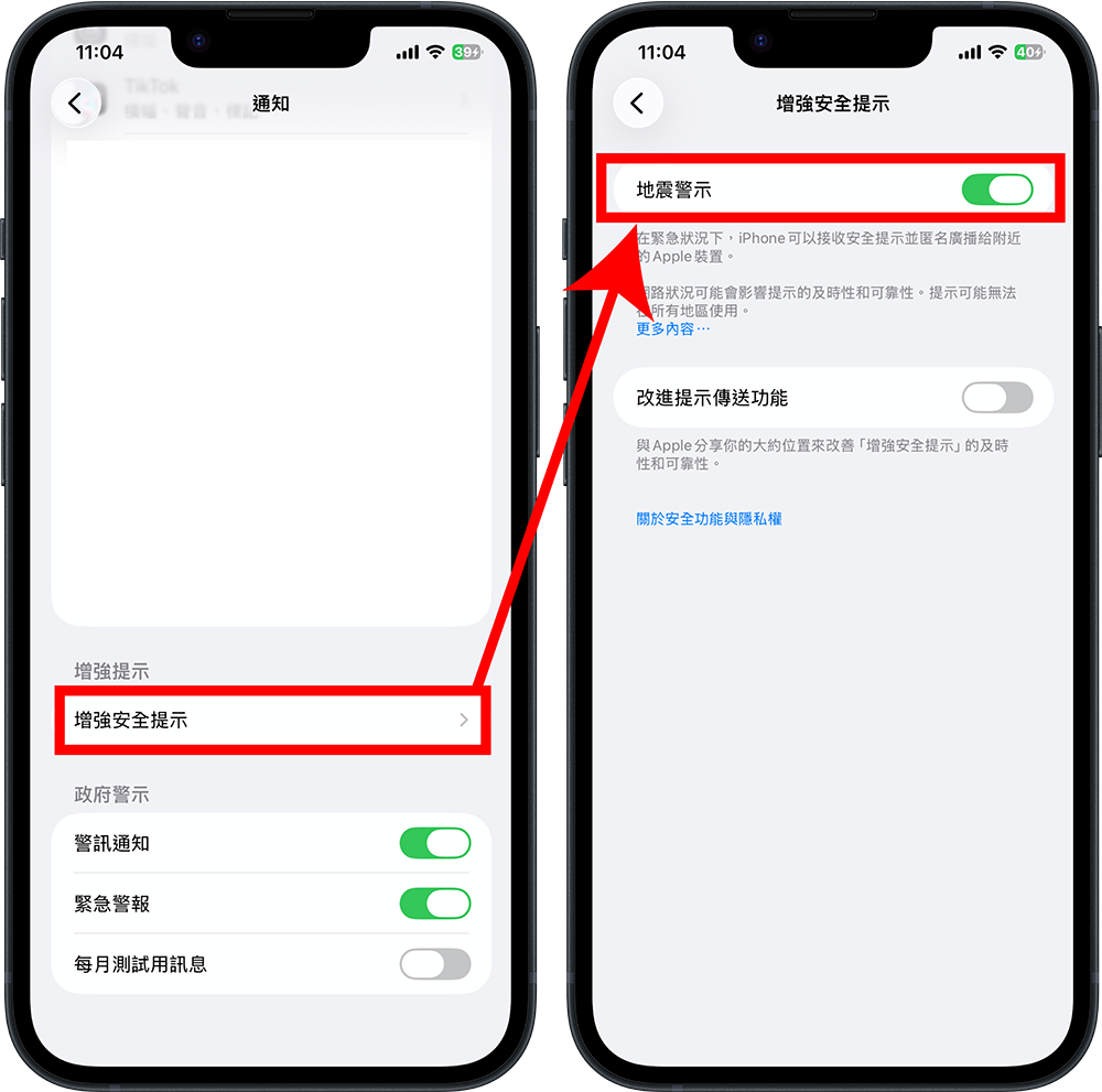 在地震警示的設定頁面當中,下方還有一個「改進提示傳送功能」的開關,這個開關如果打開的話,Apple 就會接收到用戶的大約位置來加強「增強安全提示」的可靠性以及即時性,就能在大地震來臨前收到更準確、更快速的通知,但如果是比較注重個人資料隱私的用戶,不開啟這項功能也是沒有問題的!