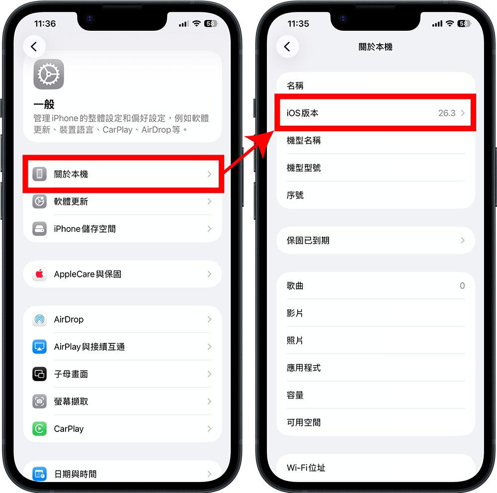 首先要先確認手機的系統的版本是否有達到 iOS 26.2 或以上,如果沒有的話就會找不到「增強安全提示」,想要檢查手機可以先點選「設定」,選擇「一般」後,接著點選「關於本機」就可以看到目前的系統版本了!如果手機版本未達 iOS 26.2 的話就要記得先進行更新喔!