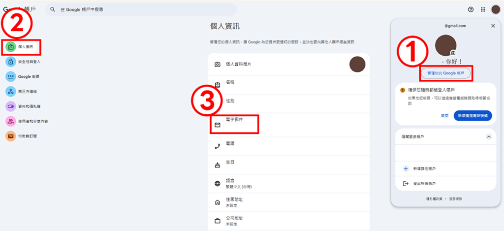 ▼ 管理你的 Google 帳戶→個人資訊→電子郵件
