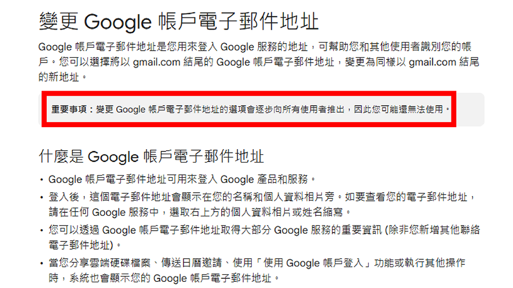▼ Google 在支援網頁中說明更改郵件地址服務為逐步推出