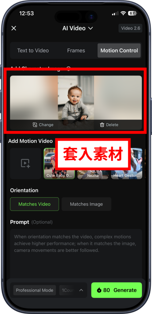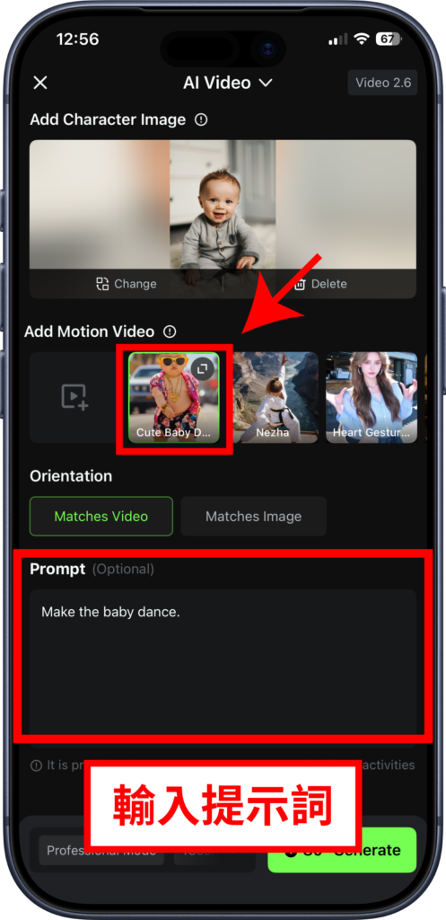- 步驟(4)、點選「Add Motion Video」中的「寶寶跳舞」效果,並於下方輸入提示詞 Make the baby dance / Let the baby dance。