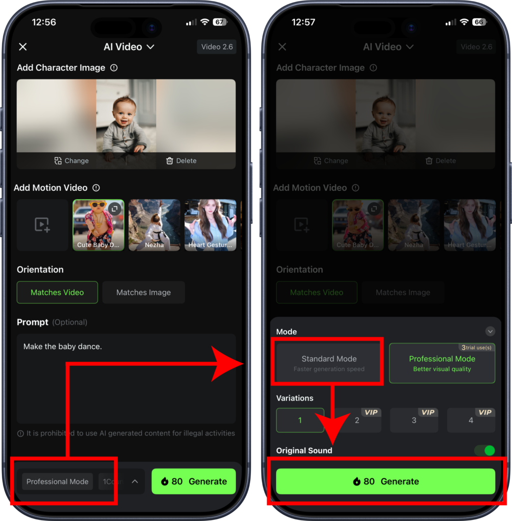 - 步驟(5)、免費版需要點選左下角更換下載 Mode 為「Standard Mode」,再點選「Generate」,待生成完畢後即可獲得「AI 寶寶跳舞」短影音。