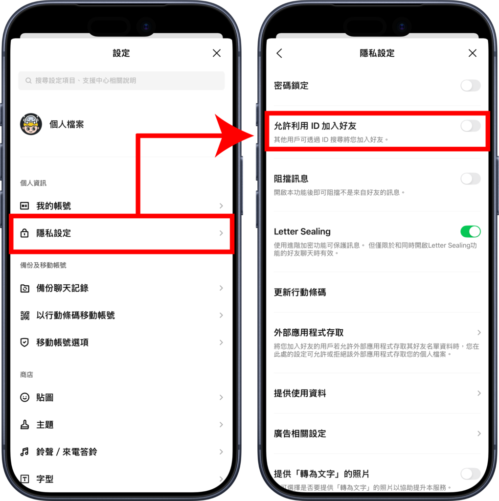 - 步驟(3)、關閉「允許利用 ID 加入好友」功能。
