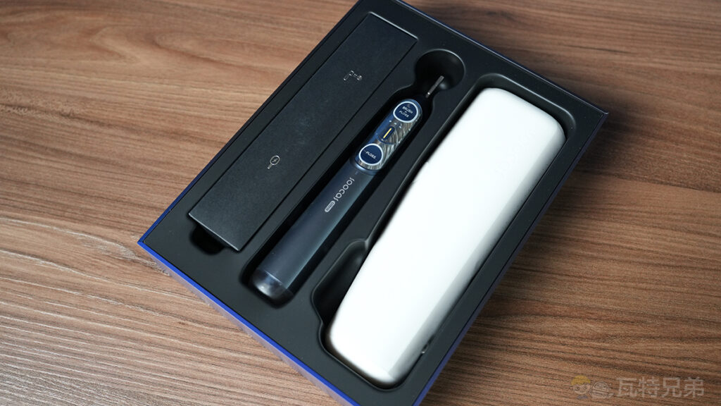 為了防止內容物因碰撞而磨損,「Soocas NEOS II Ultra」內部以精準的模具使各項組件安穩地固定在凹槽內,由左至右可分為「配件區」、「主機」以及「旅行收納盒」。