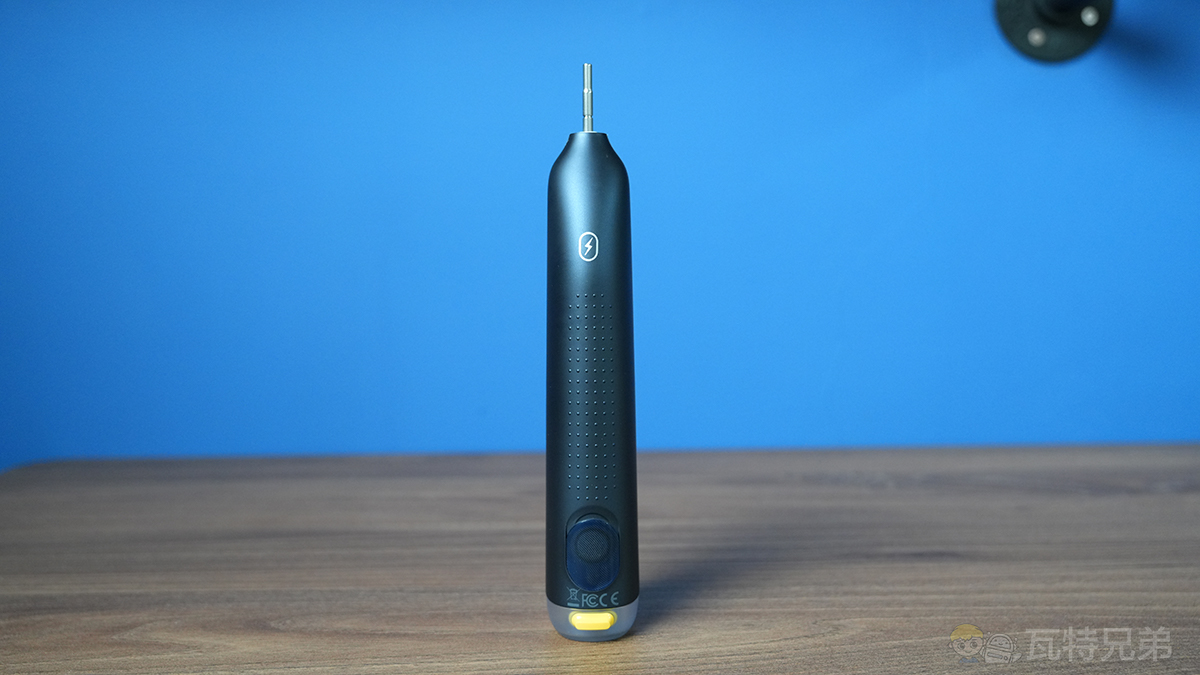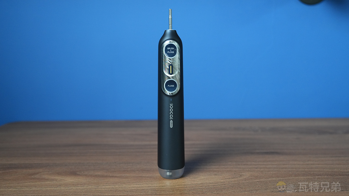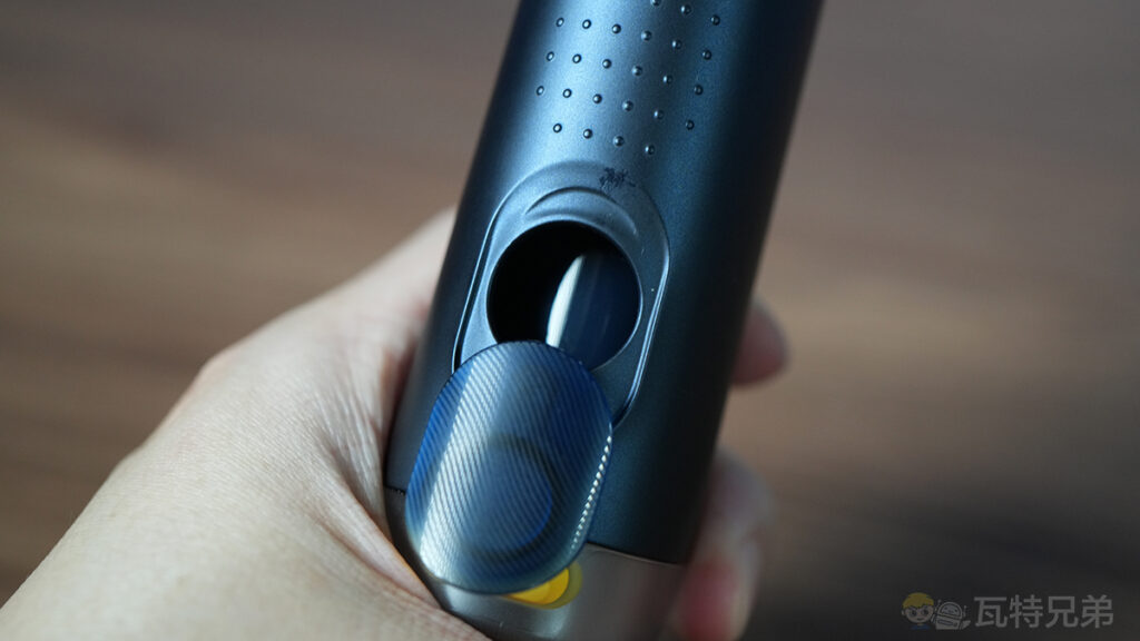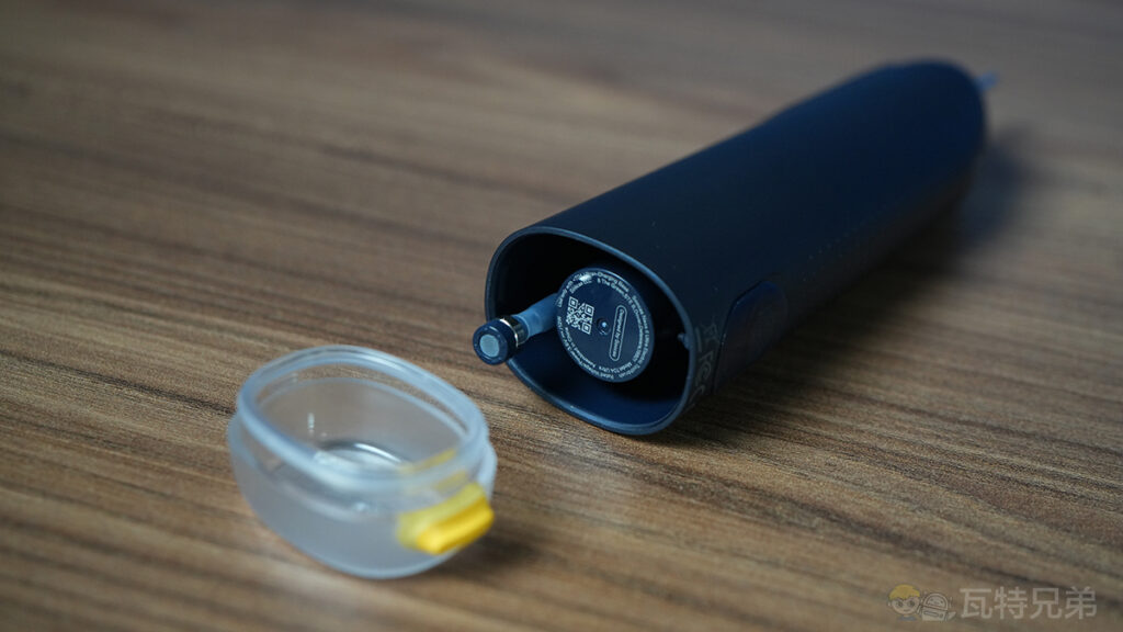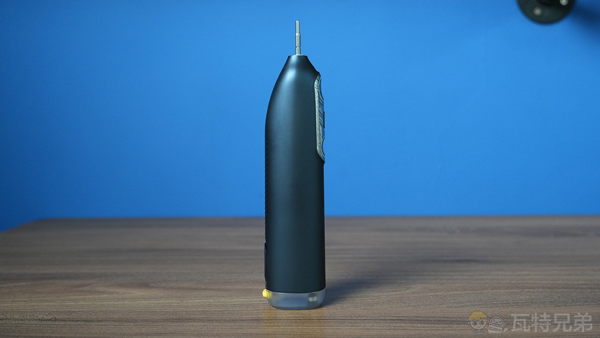 焦點拉回「電動牙刷」(本機)的部分,本次瓦特開箱的為「午夜藍」款式,儘管色系較為內斂低調,但由於表面的噴塗工藝,使其視覺感帶有金屬光澤效果,再搭配圓潤的機身線條,在不同角度的光照下,都能呈現亮麗的色澤。