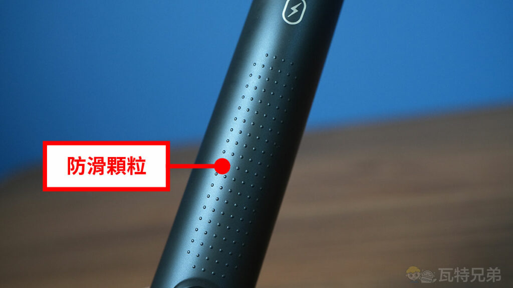 - 由於電動牙刷非常容易沾水,為預防手滑等問題,握柄後方也附加「防滑顆粒」,即使在強烈振動下,也可透過背面的防滑顆粒來增強摩擦力,防止電動牙刷在手中滑動。