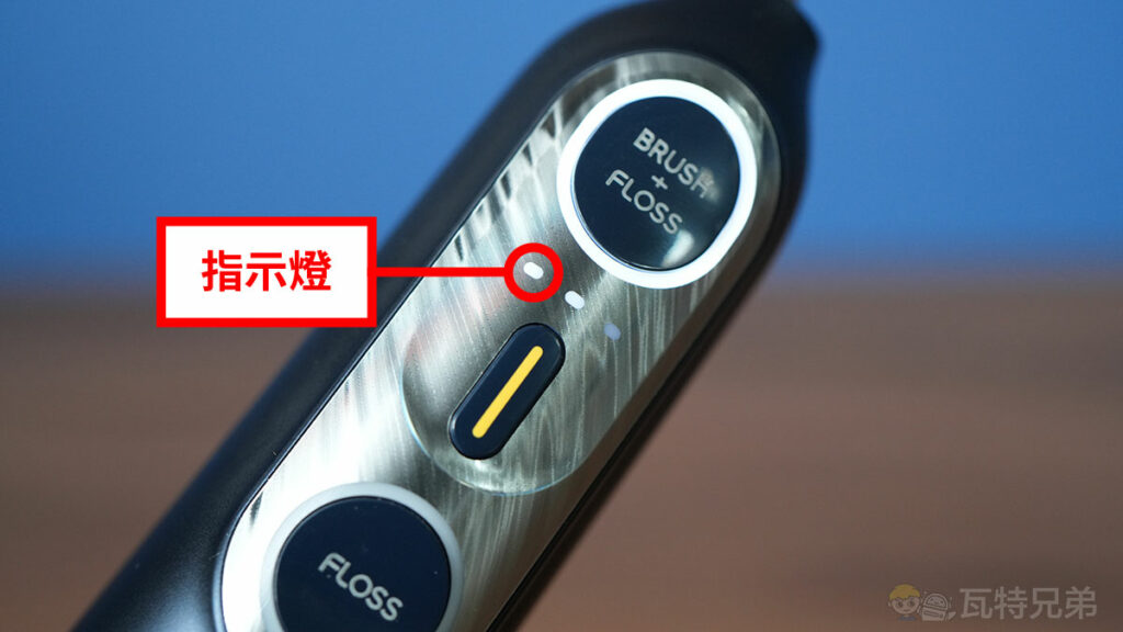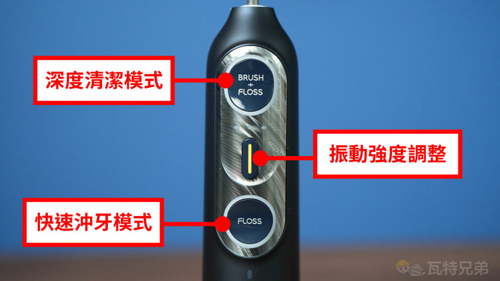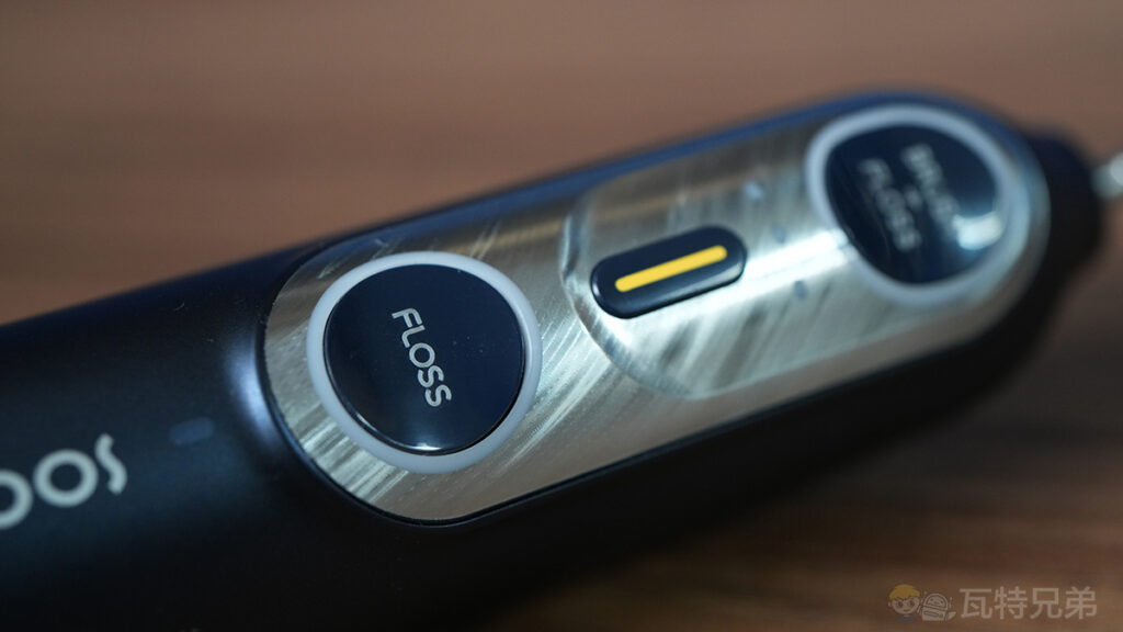 - 控制面板上主要有 3 顆功能鍵,其中上下兩顆藍色按鍵為「BRUSH + FLOSS」與「FLOSS」兩種模式,前者為「深度清潔模式」,會可提供 2 分鐘的音波刷牙 + 80 秒的沖牙;而後者則為「快速沖牙模式」,可直接啟動沖牙。