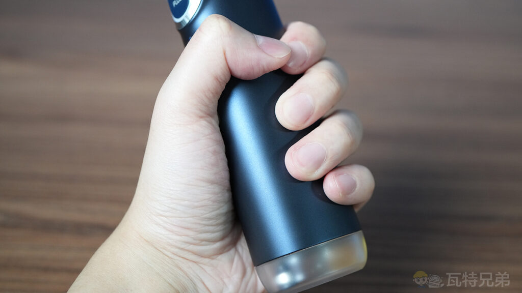 控制面板下則為電動牙刷的握柄區域,其握柄為橢圓形設計,直徑約介於 4.5cm ~ 5.3cm,就算是瓦特這類手指偏長、手掌較大的成年男性,也可以輕鬆一手掌握。