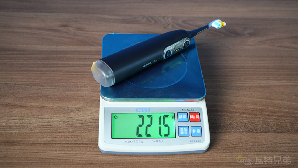 至於重量方面,「Soocas NEOS II Ultra」加上刷頭後,其總重為 221.5g(官方規格為 225g),相較於市面主流的 100g~200g 的音波震動牙刷,重量略高了一點,但就瓦特個人手感來說,並不至於影響操作體驗,反而更有扎實感。